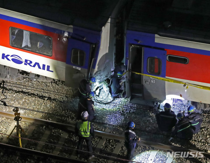 脱線列車の復旧作業に当たるKORAIL作業員たち/ソウル(5/13)