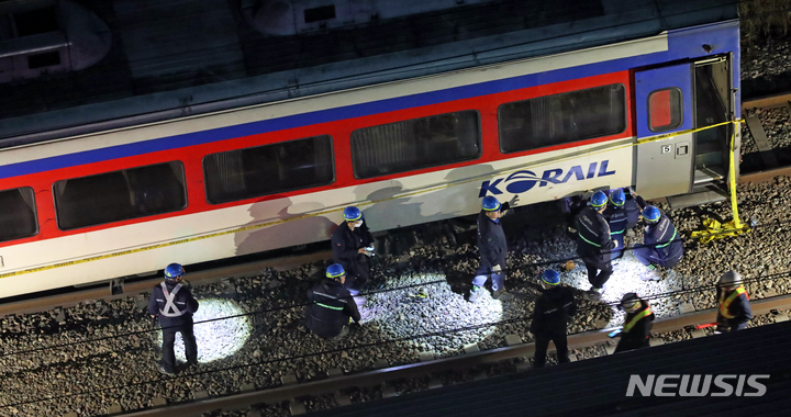 脱線列車の復旧作業に当たるKORAIL作業員たち/ソウル(6/13)