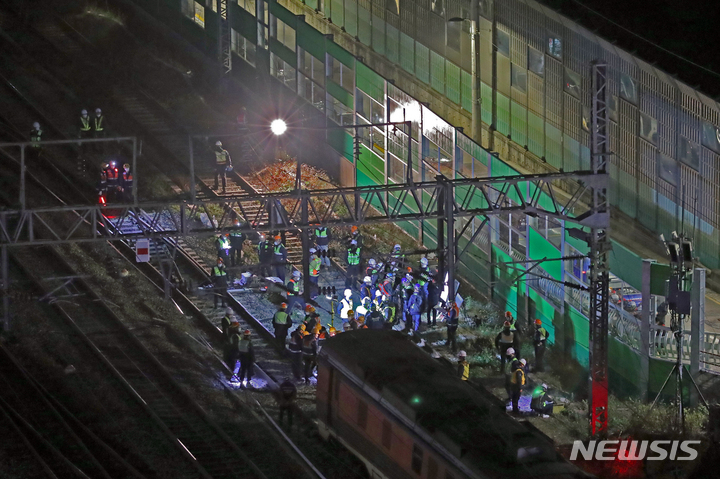 脱線列車の復旧作業に当たるKORAIL作業員たち/ソウル(7/13)