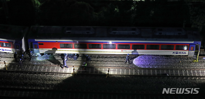 脱線列車の復旧作業に当たるKORAIL作業員たち/ソウル(8/13)