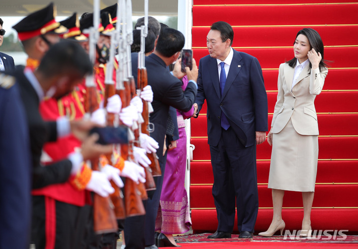 韓国大統領夫妻、カンボジアのプノンペンに到着(4/11)