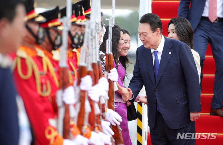 韓国大統領夫妻、カンボジアのプノンペンに到着(5/11)