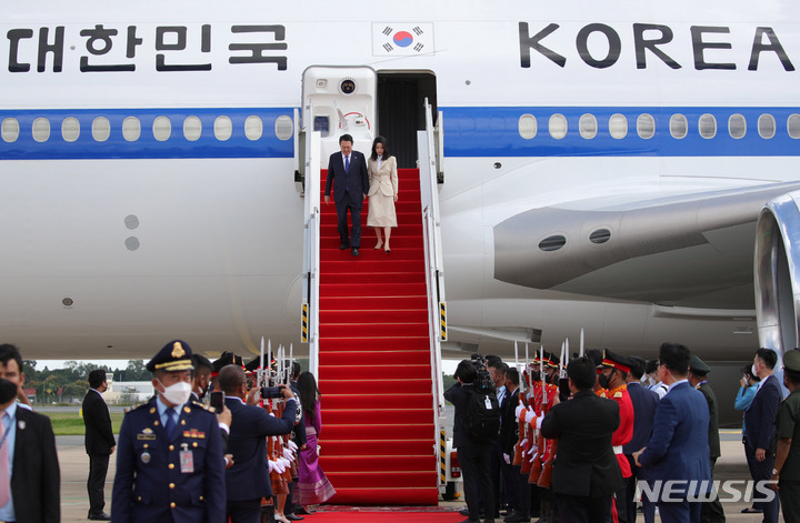 韓国大統領夫妻、カンボジアのプノンペンに到着(8/11)