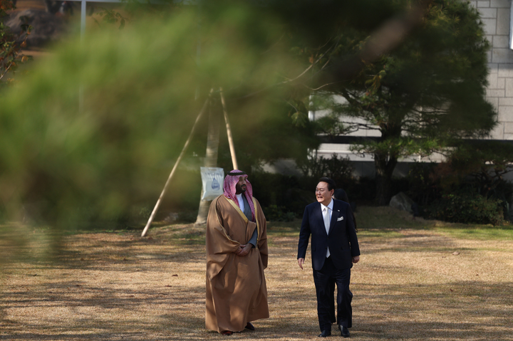 サウジのビン・サルマン皇太子と歓談する尹錫悦大統領(4/7)