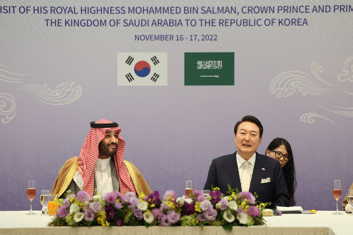 サウジのビン・サルマン皇太子と歓談する尹錫悦大統領(7/7)