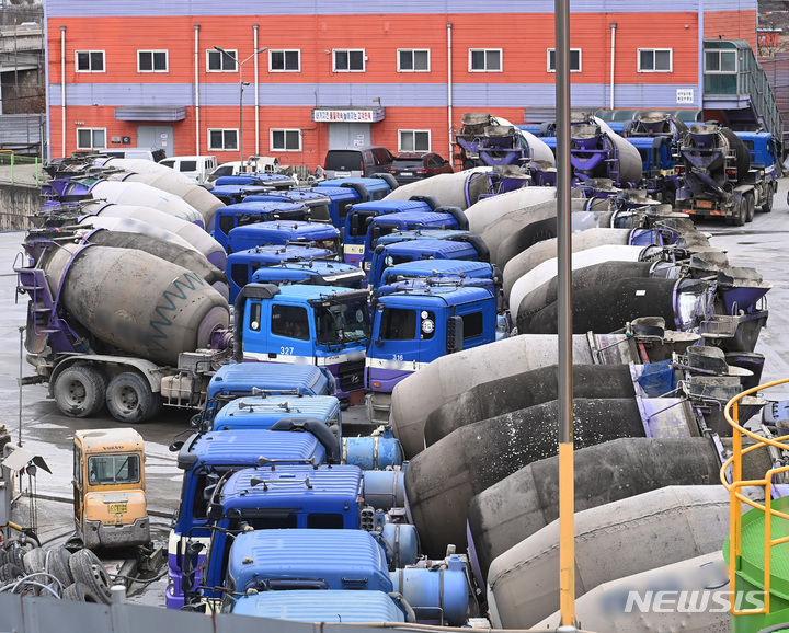 貨物連帯のストライキで停まったままのコンクリートミキサー車(1/8)