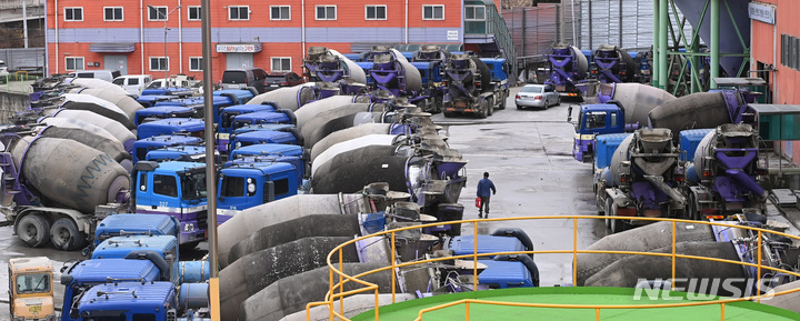 貨物連帯のストライキで停まったままのコンクリートミキサー車(2/8)