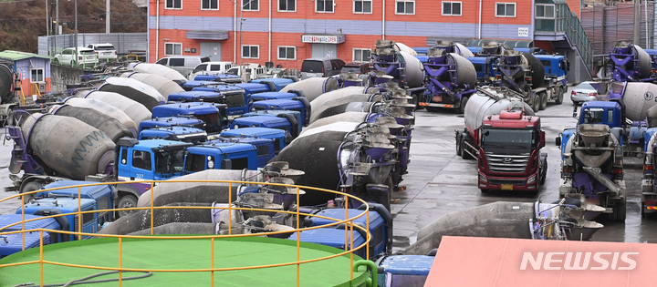 貨物連帯のストライキで停まったままのコンクリートミキサー車(7/8)