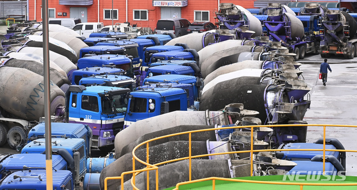 貨物連帯のストライキで停まったままのコンクリートミキサー車(8/8)