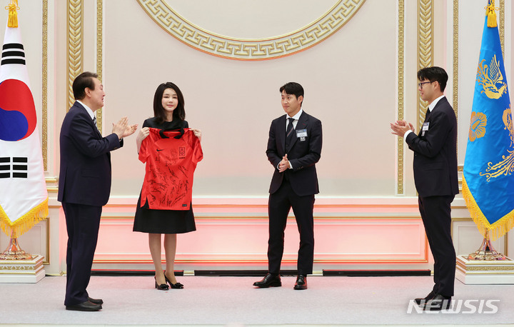 ソン・フンミン&李康仁からユニフォームとサッカーボールを贈られた尹錫悦大統領夫妻(7/8)