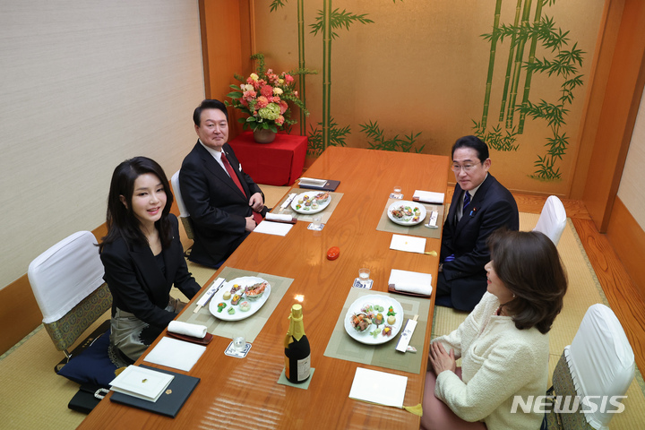 記念撮影する韓日首脳夫妻 /東京(4/7)