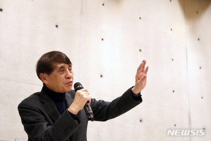 「安藤忠雄-青春」回顧展記者懇談会を行う建築家の安藤忠雄(5/14)