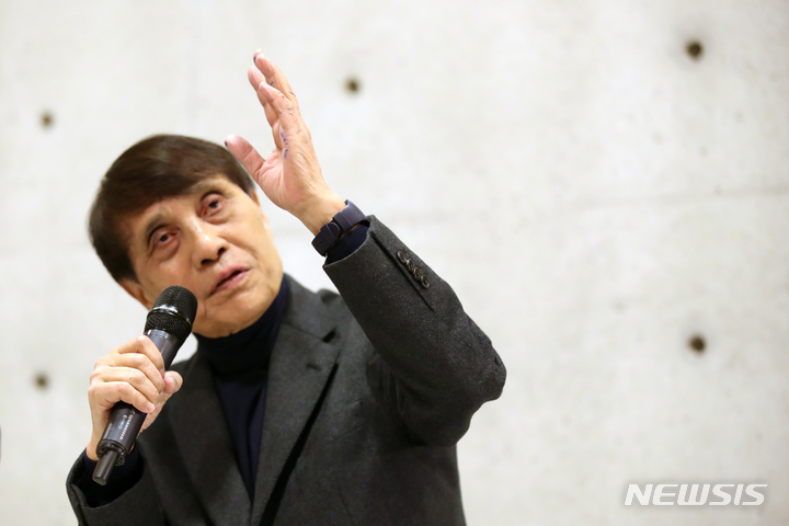 「安藤忠雄-青春」回顧展記者懇談会を行う建築家の安藤忠雄(6/14)