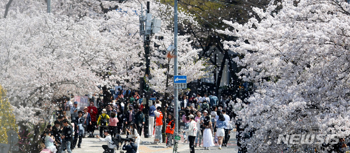 花見客でにぎわう汝矣島の桜並木 /ソウル(7/10)