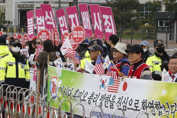 岸田首相訪韓で同時に行われた歓迎集会と糾弾集会(1/15)
