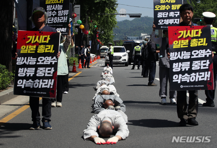 「日本の放射能汚染水放流はいけない」 僧侶が五体投地行進(3/12)