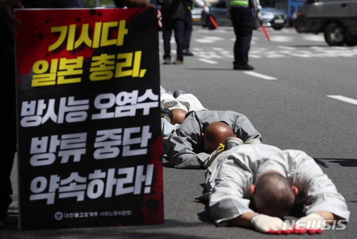 「日本の放射能汚染水放流はいけない」 僧侶が五体投地行進(4/12)