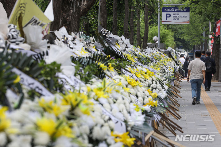 KBS前に並べられた葬儀用花輪…公営放送正常化求める(2/8)