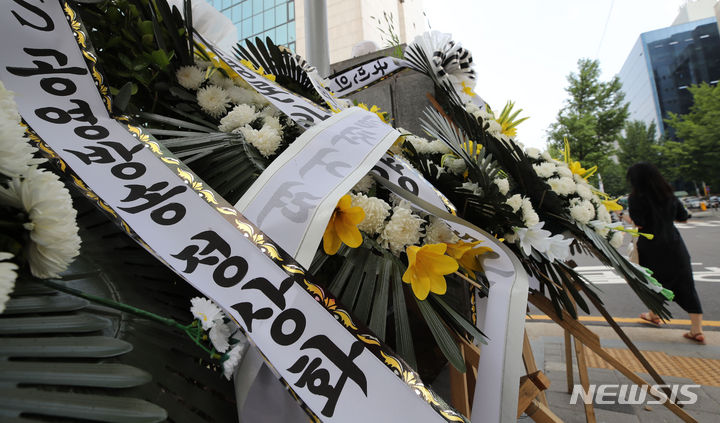 KBS前に並べられた葬儀用花輪…公営放送正常化求める(4/8)