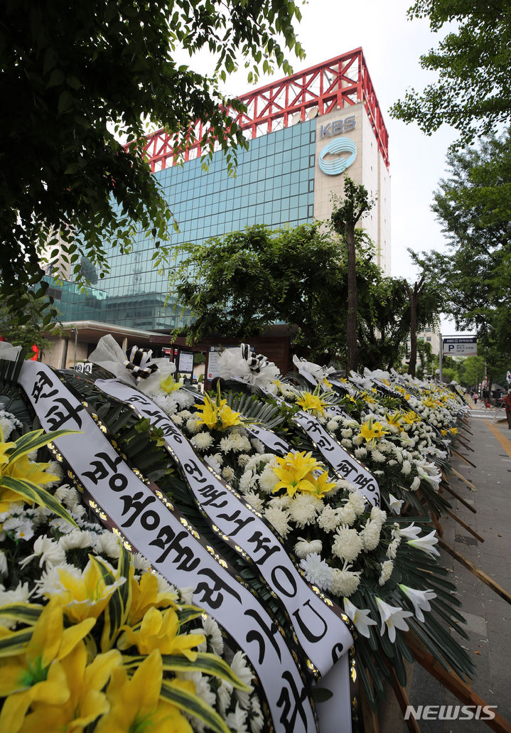 KBS前に並べられた葬儀用花輪…公営放送正常化求める(6/8)