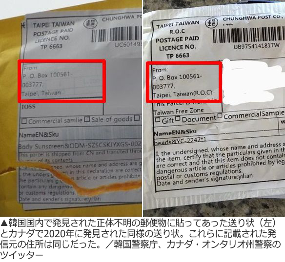韓国各地に台湾から毒物疑い郵便物…発信元は3年前にカナダで起きた「謎の種事件」と同じ(2/2)