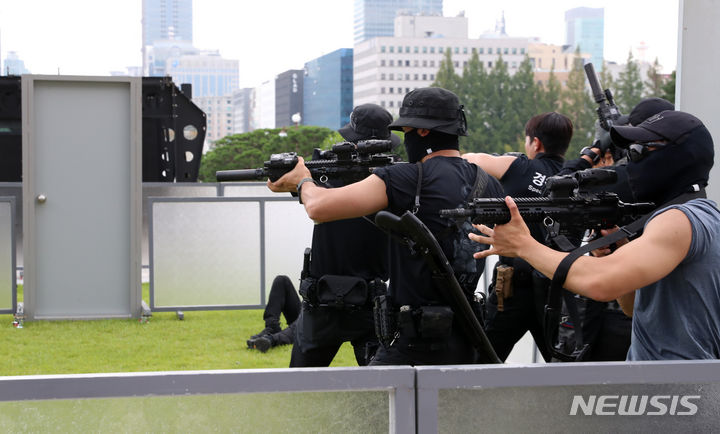 テロ鎮圧の予行練習をする警察特攻隊(7/9)