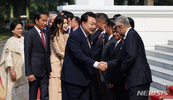 韓国大統領夫妻、インドネシア側の公式歓迎式典に出席(6/10)