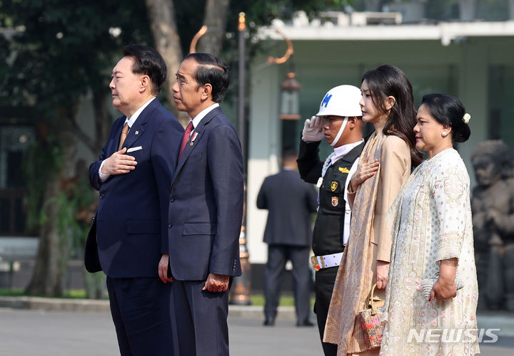 韓国大統領夫妻、インドネシア側の公式歓迎式典に出席(7/10)