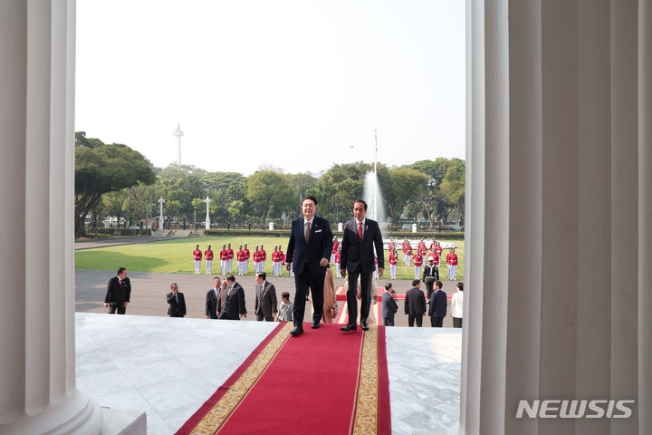 韓国大統領夫妻、インドネシア側の公式歓迎式典に出席(9/10)