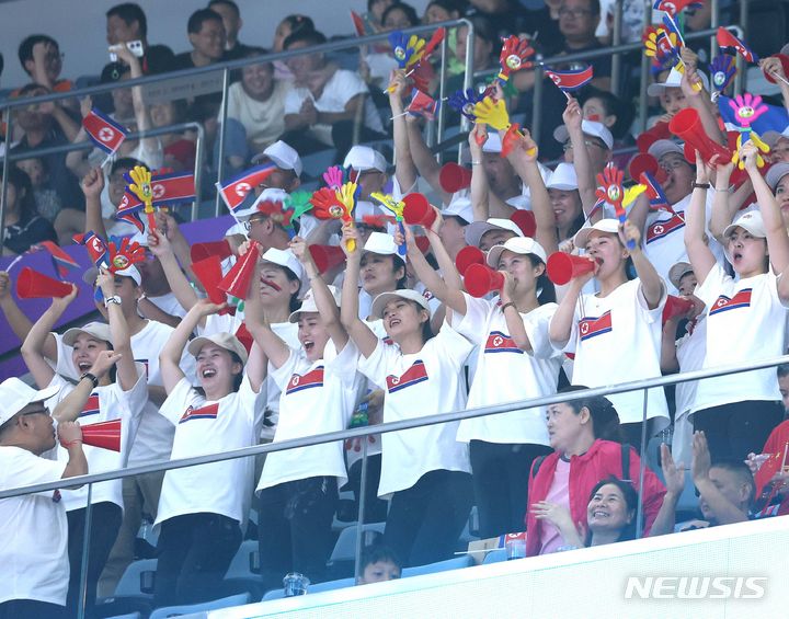 バスケ女子の試合で選手たちを応援する北朝鮮の応援団(2/10)