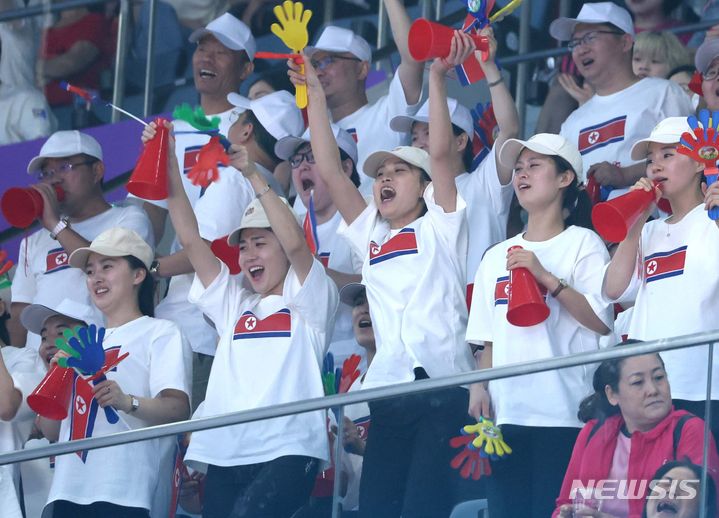 バスケ女子の試合で選手たちを応援する北朝鮮の応援団(9/10)