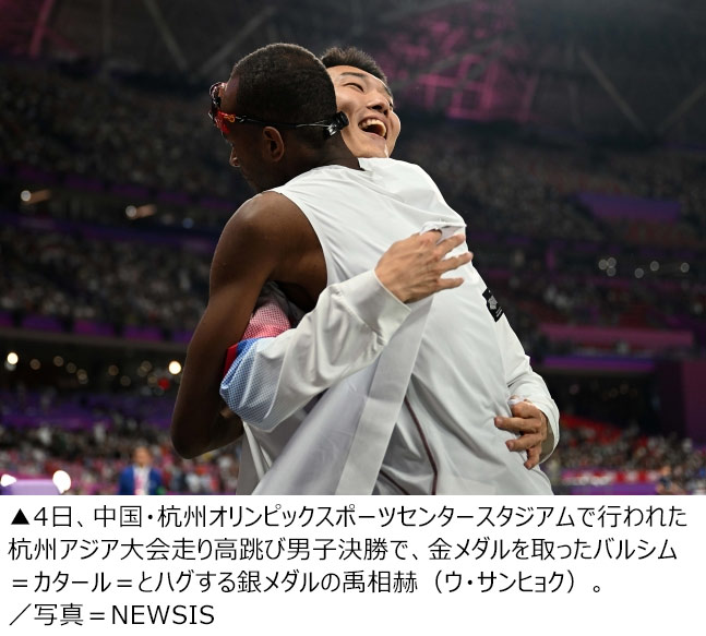 バルシムに近寄り笑顔でハグ…男子走り高跳び銀メダル禹相赫の競技マナーが話題に 杭州アジア大会(1/2)