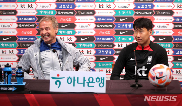 チュニジア戦を前に記者会見するクリンスマン監督と主将ソン・フンミン(2/3)