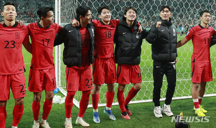 圧勝して喜ぶサッカー韓国代表チーム(2/17)