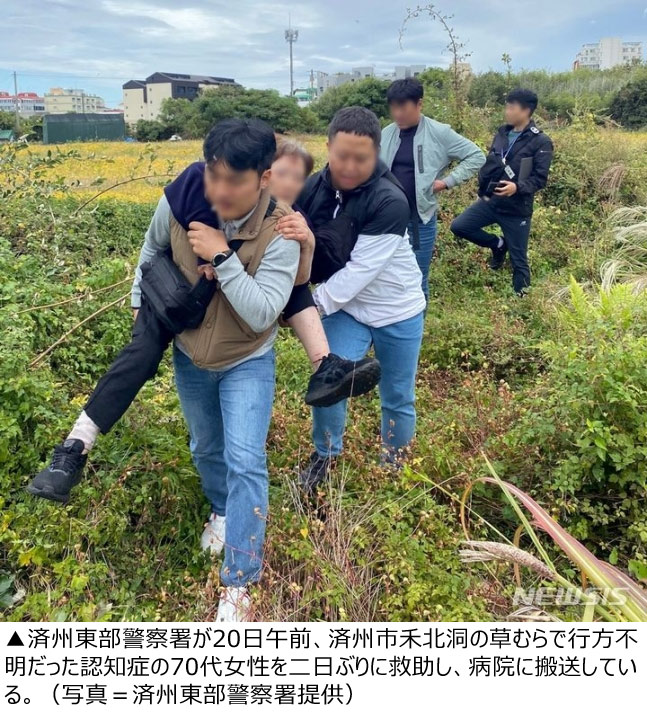 草むらに倒れていた認知症の70代女性、40時間ぶりに家族のもとへ /済州(2/2)