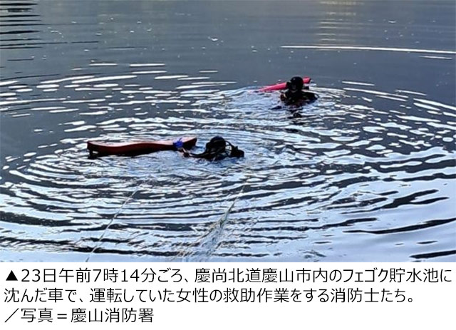 運転中の韓国50代女性が貯水池に転落、1時間後に水深5m地点で救助 /慶山(2/2)