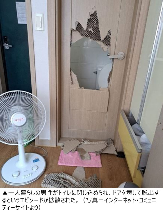 自宅トイレに閉じ込められた一人暮らしの韓国男性、ドアを壊して脱出(2/2)