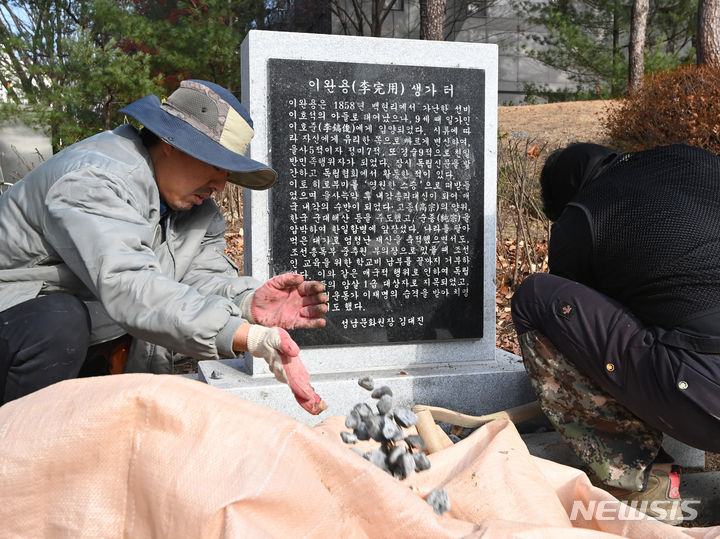 緊急撤去される李完用生家跡の碑石 =城南市ペクヒョン洞(3/14)