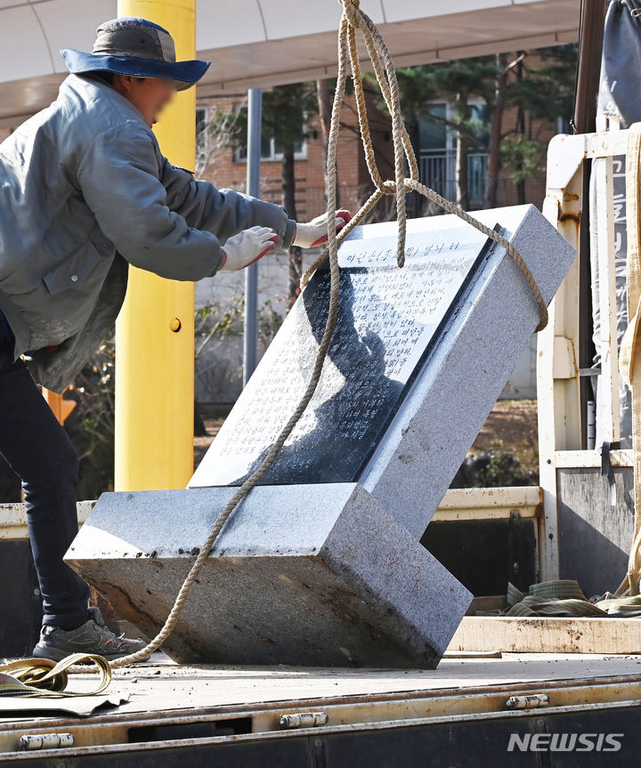 緊急撤去される李完用生家跡の碑石 =城南市ペクヒョン洞(4/14)
