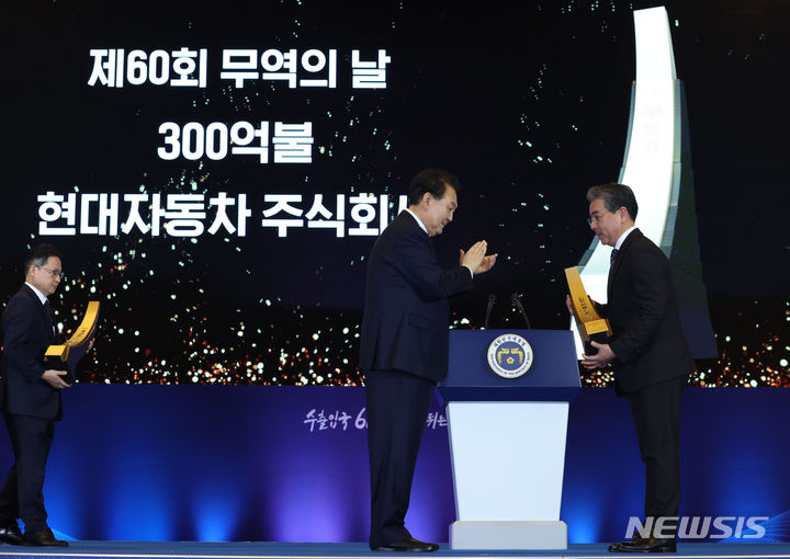 LGイノテック社長に「100億ドル輸出の塔」を授与する韓国大統領(2/9)