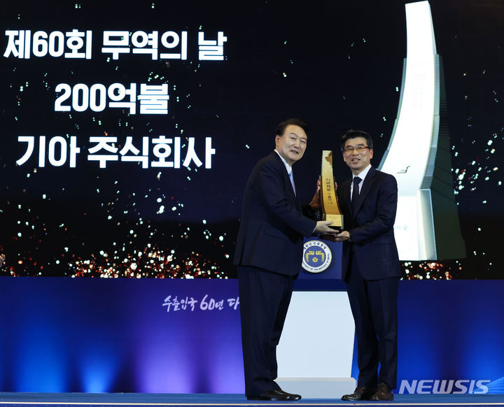 LGイノテック社長に「100億ドル輸出の塔」を授与する韓国大統領(6/9)