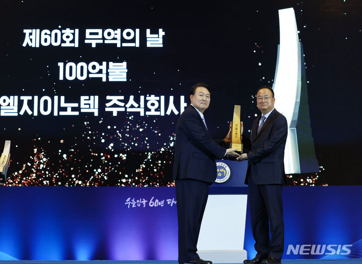 LGイノテック社長に「100億ドル輸出の塔」を授与する韓国大統領(8/9)