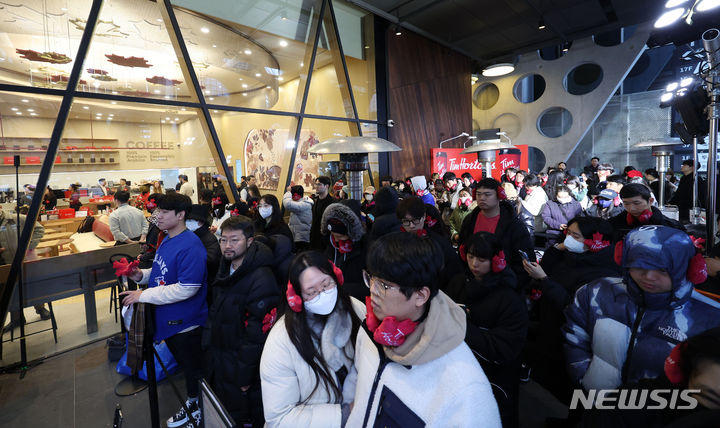 カナダのコーヒーチェーン「Tim Hortons」韓国1号店のグランドオープンを待つ市民(2/11)