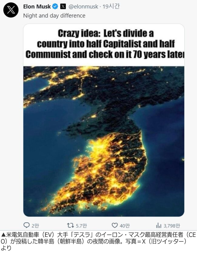 70年前の選択が生んだ違い…イーロン・マスク氏、韓半島の画像を投稿(2/2)