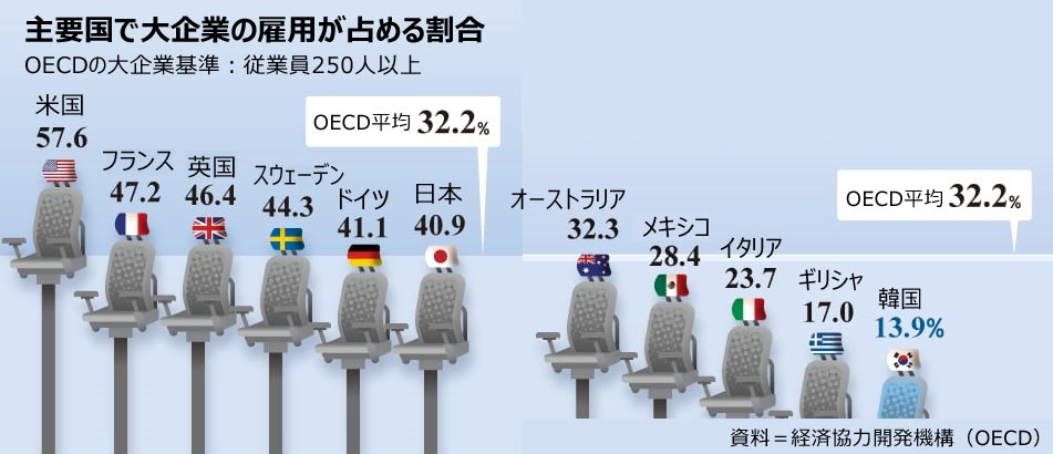 少子化の一因は大企業の雇用不足? 大企業が雇用全体に占める割合、韓国はOECD最下位(2/2)