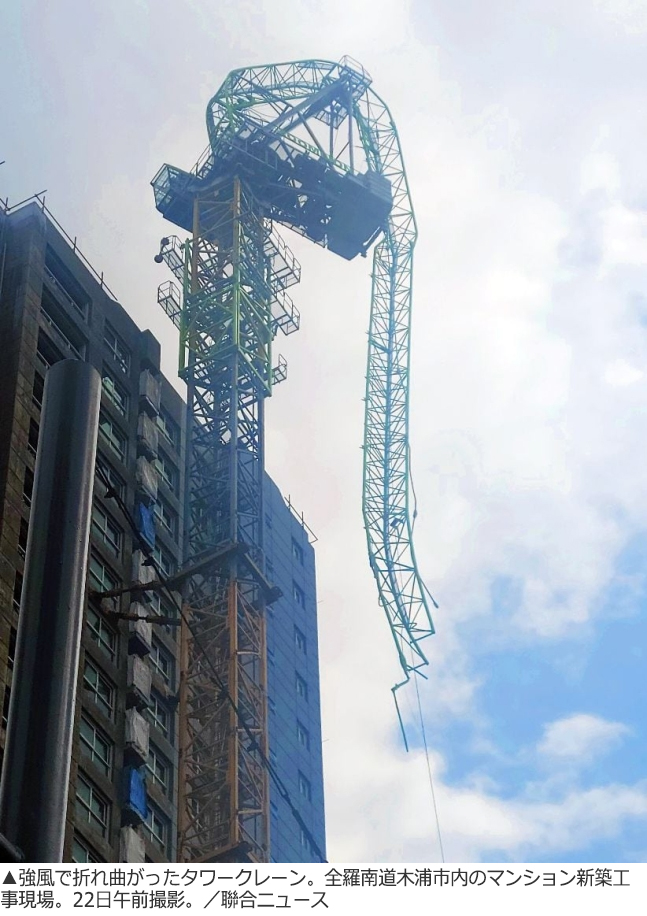 時速89キロの強風で工事現場のタワークレーンがグニャリ /全羅南道(2/2)