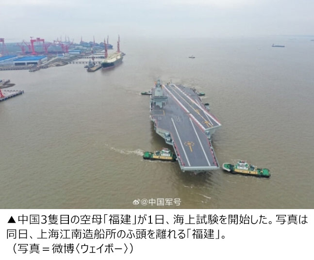 艦名の由来は台湾の対岸…中国3隻目の空母「福建」が初の試験航海(2/2)