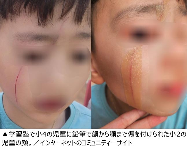 学習塾で授業中に鉛筆で額から顎まで引っかかれた小2児童、傷跡の写真に韓国ネット民憤慨(2/2)