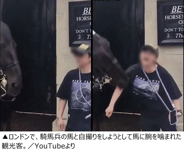 ロンドンで近衛騎兵隊と自撮り試みた女性観光客、馬に噛まれて失神(2/2)