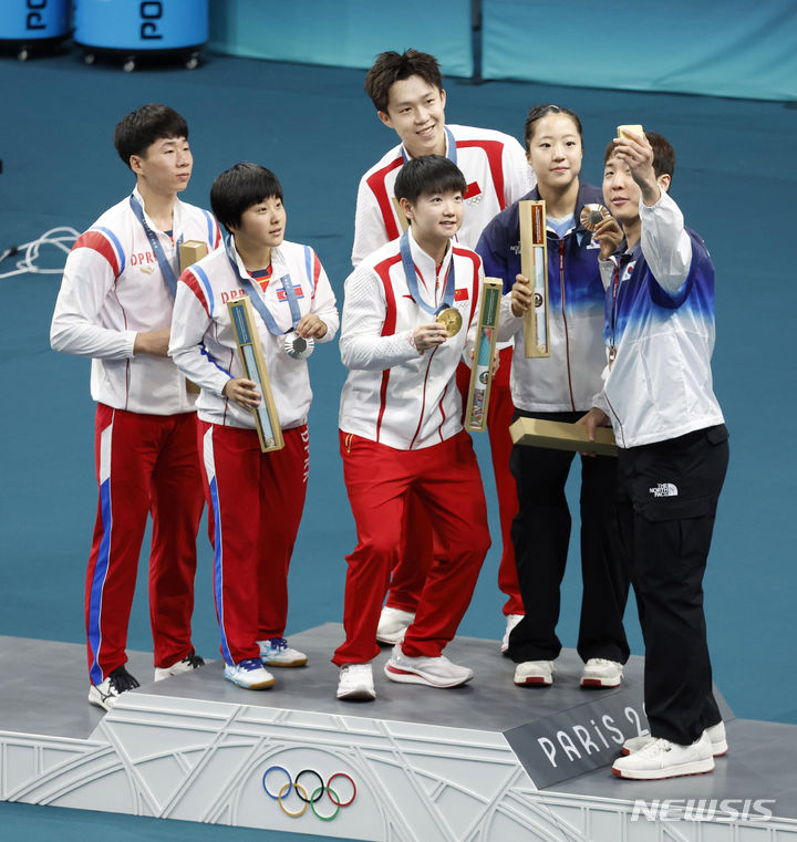 卓球混合ダブルス授賞式で南北が記念ショット パリ五輪(2/16)